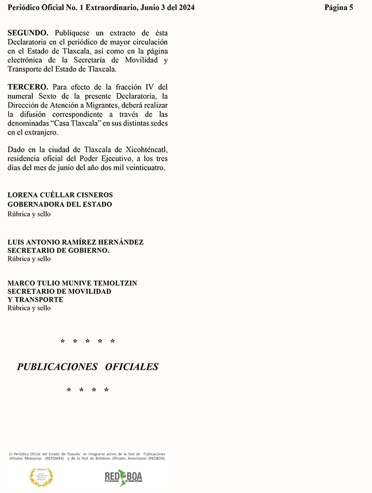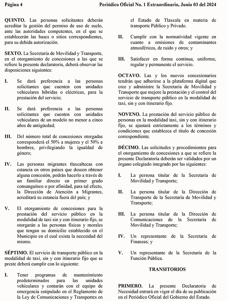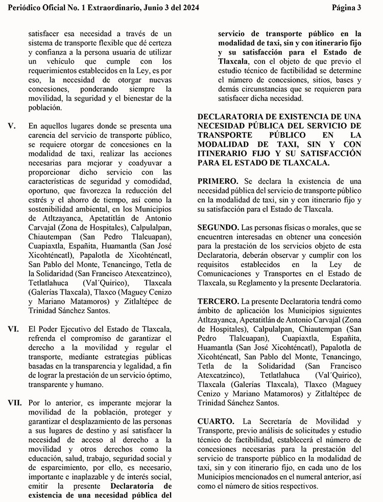 De acuerdo con la publicación No. 1 Extraordinario, la titular del Poder Ejecutivo Local, Lorena Cuéllar Cisneros ordenó la “Declaratoria de existencia de una necesidad pública del servicio de transporte público en la modalidad de taxi, sin y con itinerario fijo y su satisfacción para el estado de Tlaxcala».