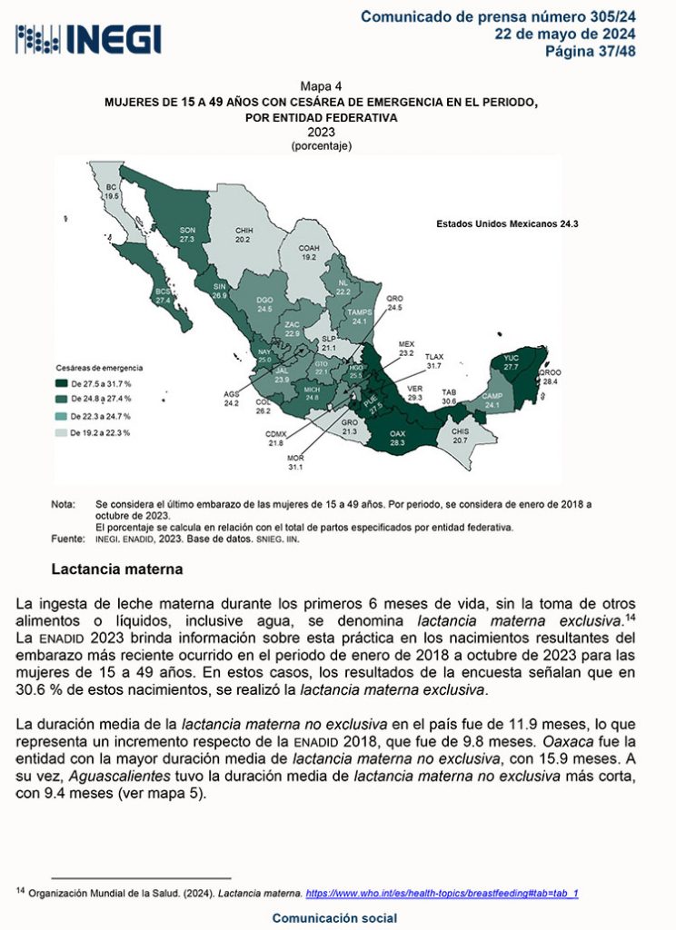 En este sentido, es importante señalar que, ‘A nivel nacional, de cada 100 partos, 49 fueron vía vaginal y 51 fueron cesáreas. De estas, 27 fueron programadas y 24, de emergencia’, siendo los estados de Tamaulipas, Sinaloa y Nuevo León, donde más cesáreas programadas hubo.