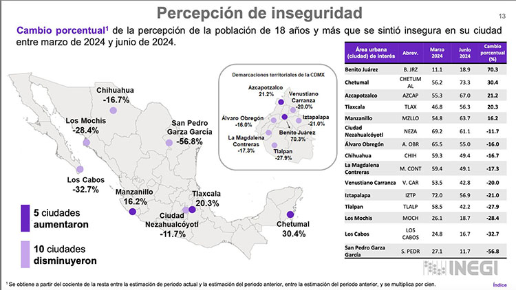 Con ello, Tlaxcala fue la segunda entidad con mayor aumento en dicha medición, siendo parte de las únicas dos ciudades con tal situación, junto con Chetumal, en Quintana Roo, que pasó de 53.9 por ciento a 73.3, incrementando la Percepción de Inseguridad 19.4 por ciento en un año.