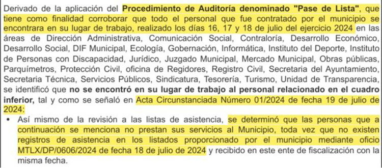 Los nombres de los presuntos “aviadores” quedaron asentados en el acta circunstanciada 01/2024 de fecha 19 de julio de 2024, en la que se determinó que esas personas “no prestan sus servicios al municipio, toda vez que no existen registros de asistencia en los listados proporcionado por el municipio mediante oficio MTLX/DP/0606/2024 de fecha 18 de julio de 2024”.