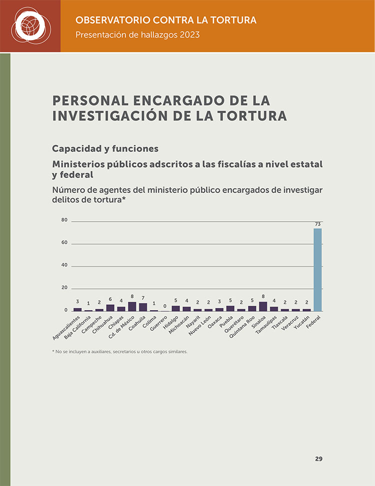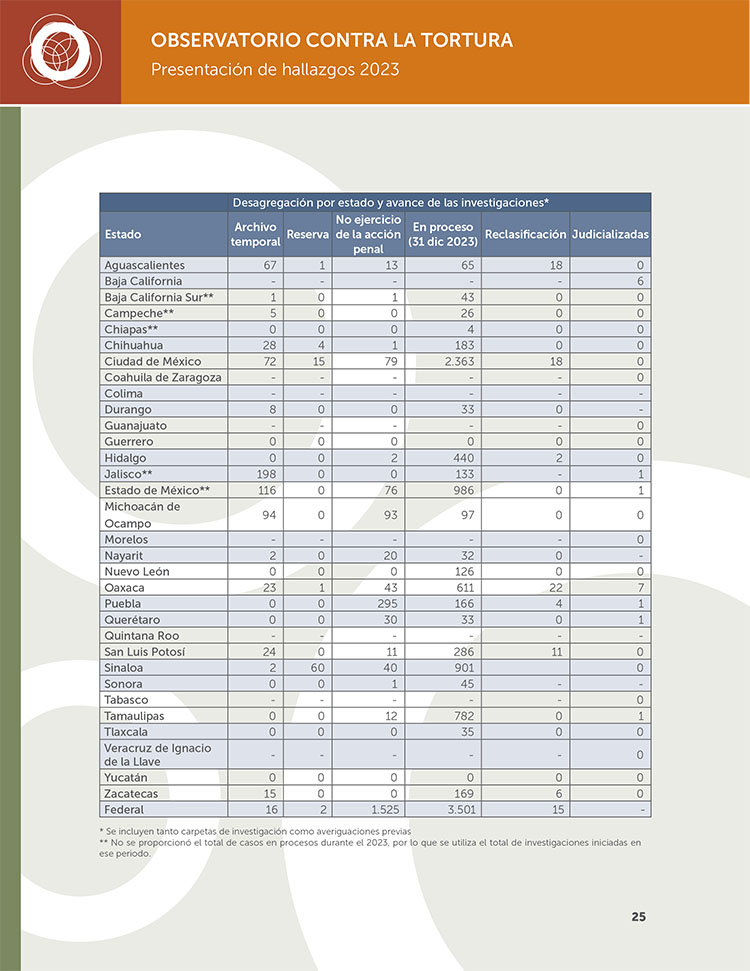 El ‘Observatorio contra la Tortura’ destacó también que, de estas 35 Carpetas de Investigación iniciadas, ninguna ha sido judicializada, toda vez que, en Tlaxcala solamente se cuenta con dos agentes del Ministerio Público dedicados a la investigación de dicho delito.