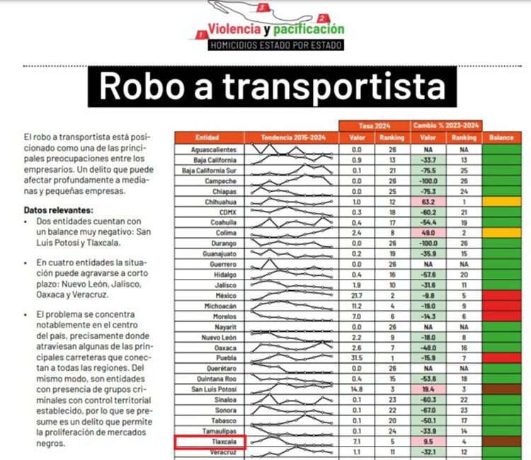 Tlaxcala se ubicó entre los primeros lugares a nivel nacional con un balance “muy negativo” en robo a transportistas, secuestro y feminicidios, ya que muestran una tendencia al alza, según la organización México Evalúa en su Reporte Anual de Incidencia Delictiva de Alto Impacto 2015-2024 que tiene como objetivo “detectar los principales focos rojos en materia de seguridad pública a partir del análisis de las dinámicas locales de las violencias”.