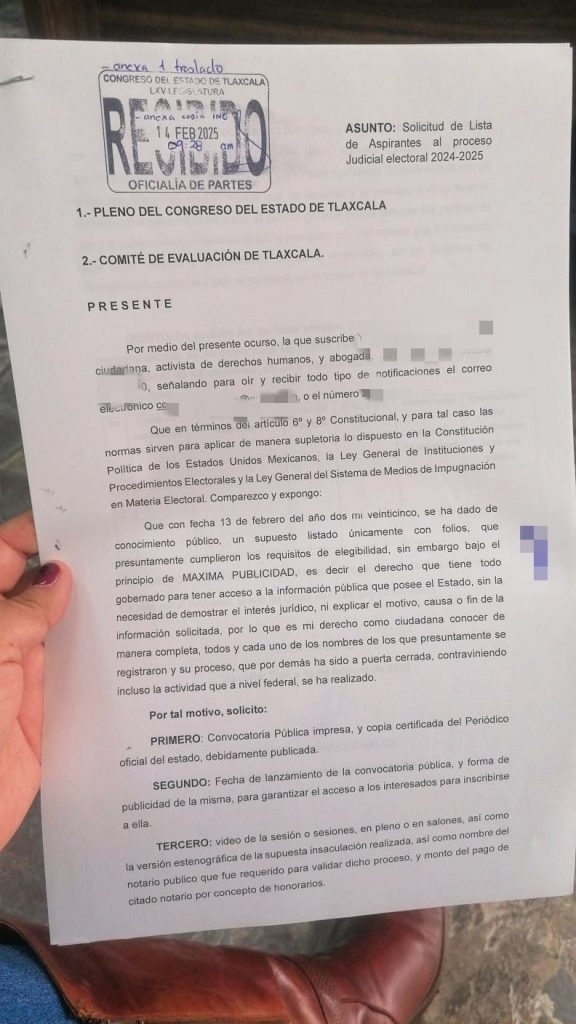 La también abogada y defensora de derechos humanos remitió al Congreso del Estado y, a su vez, al Comité Estatal de Evaluación (CEE) un oficio a través del cual solicita conocer el listado de las y los aspirantes que acudieron a inscribirse para el PEEPJ, así como el nombre de quienes fueron seleccionados para continuar a la siguiente etapa del proceso.