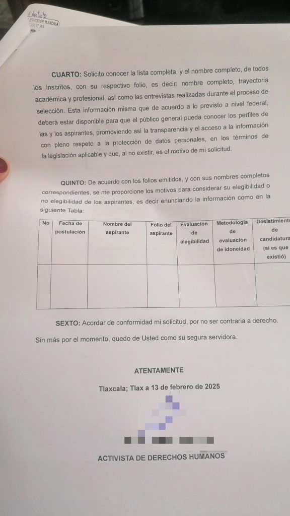 Bajo dicho tenor, la activista también solicitó conocer los motivos para considerar la elegibilidad o no elegibilidad de los aspirantes, ya que, según la Convocatoria General Pública, los criterios de evaluación se centran principalmente en contar con “buena fama”.