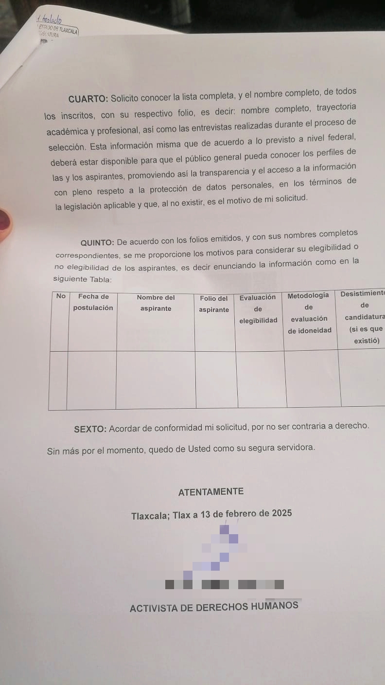 “Solicito conocer la lista completa y el nombre completo de todos los inscritos con su respectivo folio, es decir, nombre completo, trayectoria académica y profesional, así como las entrevistas realizadas durante el proceso de selección”, reza el documento recibido por el Congreso Local.