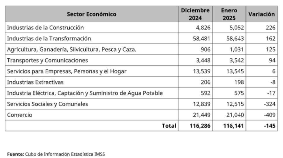 Por Sector Económico “Comercio” perdió 409 plazas, pasando de 21 mil 449 al corte del 31 de diciembre del año inmediato anterior a 21 mil 040 al 31 de enero de este año; mientras que “Servicios Sociales y Comunales” cayó de 12 mil 839 a 12 mil 515, perdiendo 324 lugares.