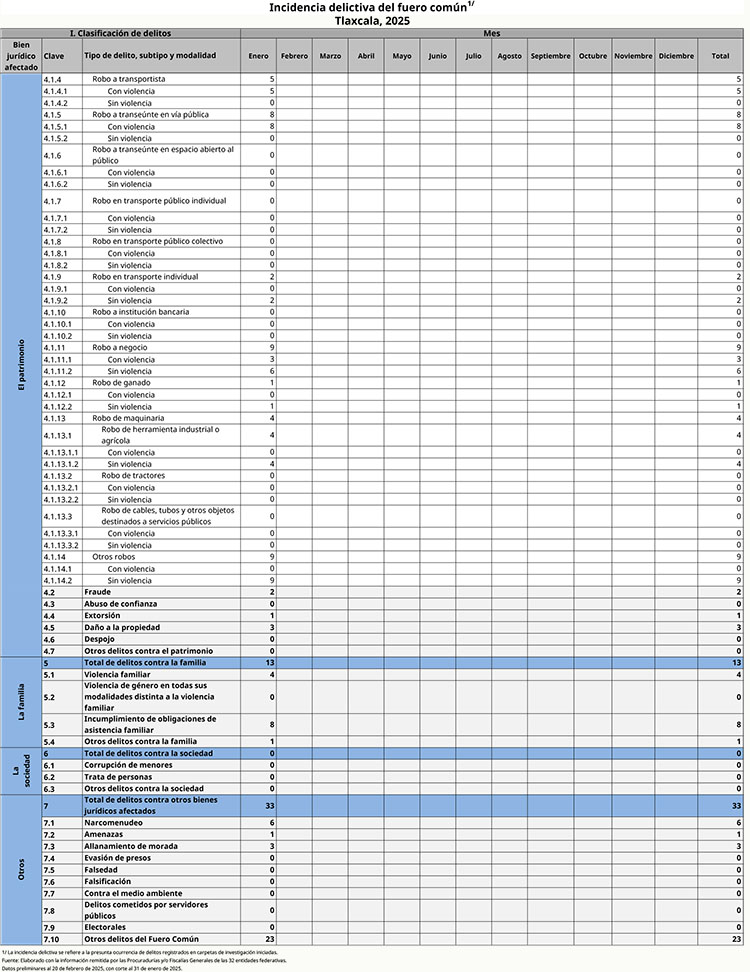 Igualmente, en el rubro de “Delitos contra el patrimonio”, respecto al mes de enero, en Tlaxcala, se dio cuenta de dos casos de “Fraude”, uno de “Extorsión” y tres de “Daño a la propiedad”.