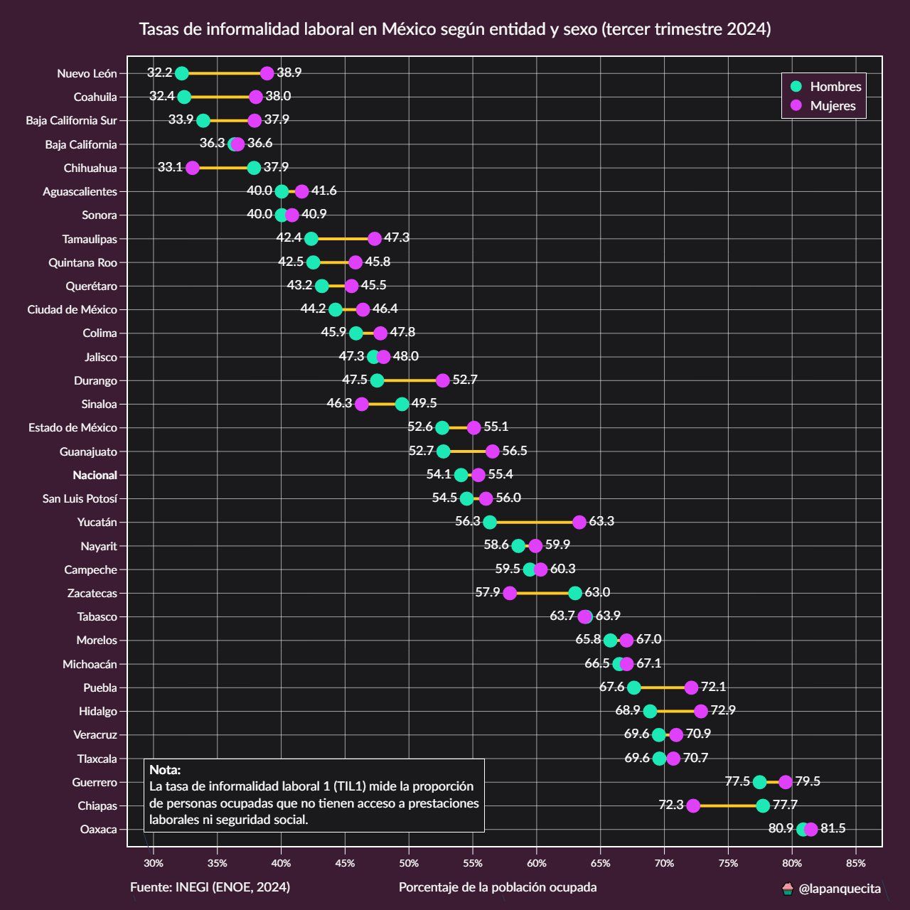 De acuerdo con el informe, Oaxaca, Chiapas y Guerrero encabezan la lista con las tasas más altas de informalidad laboral, alcanzando niveles superiores al 79% en el caso de las mujeres. En contraste, Nuevo León y Coahuila registran los niveles más bajos, con cifras que oscilan entre el 32% y el 40%.