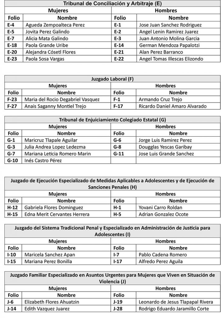 Sin embargo, ello no sucedió sino hasta este miércoles, cuando se difundió la lista de aspirantes al TCyA, encabezada por Águeda Zempoalteca Pérez, con el Folio E4; Jovita Pérez Galindo, E5; Alicia Mata Galindo, E7; y Paola Grande Uribe, E18.