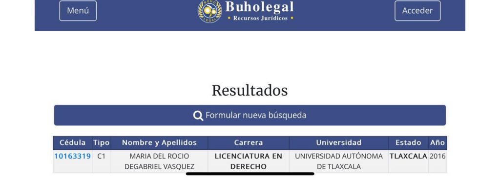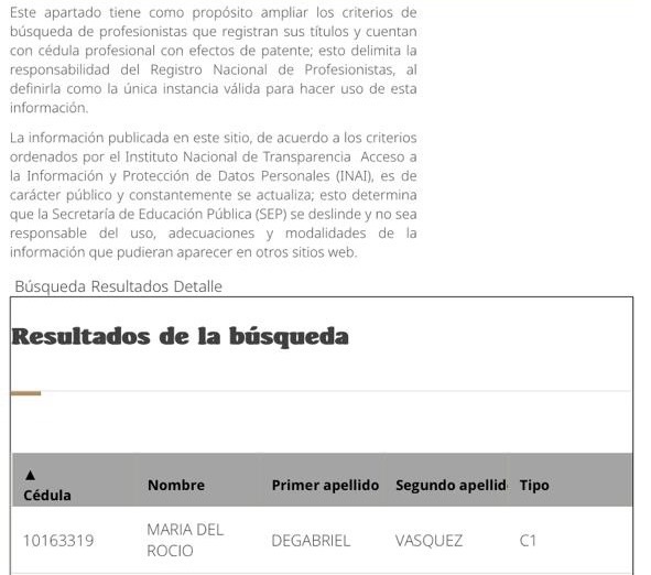 Aunque en una primera búsqueda en el Registro Nacional de Profesionistas no apareció el nombre de María del Rocío Degabriel Vásquez, en un segundo momento se descubrió que sí cuenta con su cédula profesional en la licenciatura de Derecho.