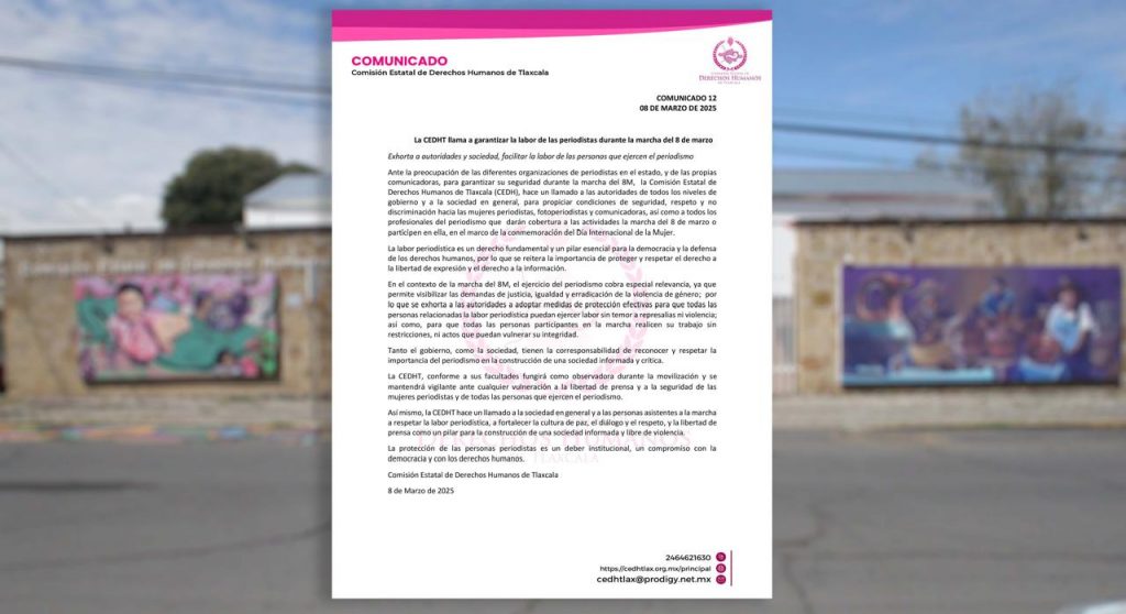 Ante la preocupación de las diferentes organizaciones de periodistas en el estado, y de las propias comunicadoras, para garantizar su seguridad durante la marcha del 8M, la Comisión Estatal de Derechos Humanos de Tlaxcala (CEDH), hace un llamado a las autoridades de todos los niveles de gobierno y a la sociedad en general, para propiciar condiciones de seguridad, respeto y no discriminación hacia las mujeres periodistas, fotoperiodistas y comunicadoras, así como a todos los profesionales del periodismo que darán cobertura a las actividades la marcha del 8 de marzo o participen en ella, en el marco de la conmemoración del Día Internacional de la Mujer.