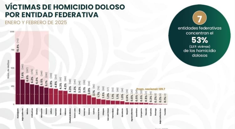En el balance difundido durante la conferencia mañanera encabezada por la presidenta Claudia Sheinbaum, se destaca que la entidad pasó del séptimo al quinto lugar en homicidios, con un total de 21 casos en los primeros dos meses de 2025, aunque, el año anterior en el primer bimestre del años se contabilizaron 18, evidenciando así un aumento de tres casos entre un año y otro.