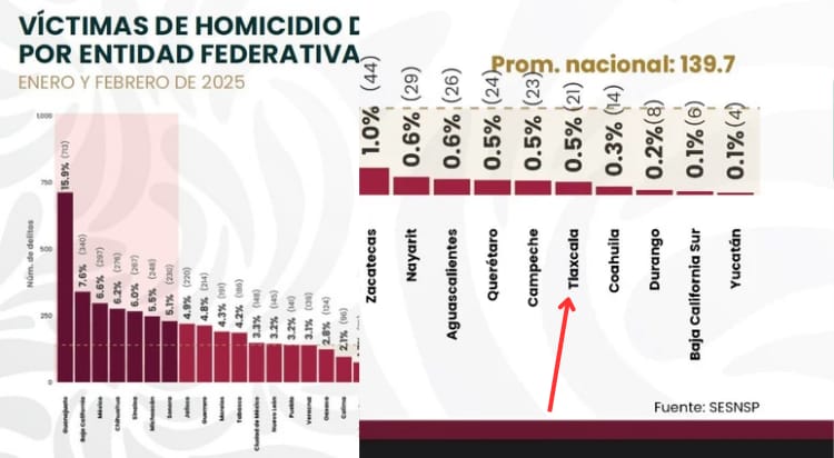 Tras revelarse los datos oficiales, el gobierno de Tlaxcala presumió una posición destacada entre los estados con menos homicidios, solo superado por entidades como Yucatán, Baja California Sur, Durango y Coahuila.
