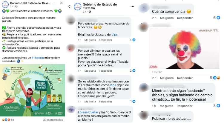 Decenas de comentarios en la publicación acusaron a la administración estatal de avalar prácticas que dañan el medio ambiente, como la tala de árboles en espacios públicos y la falta de auditorías ambientales a empresas contaminantes.