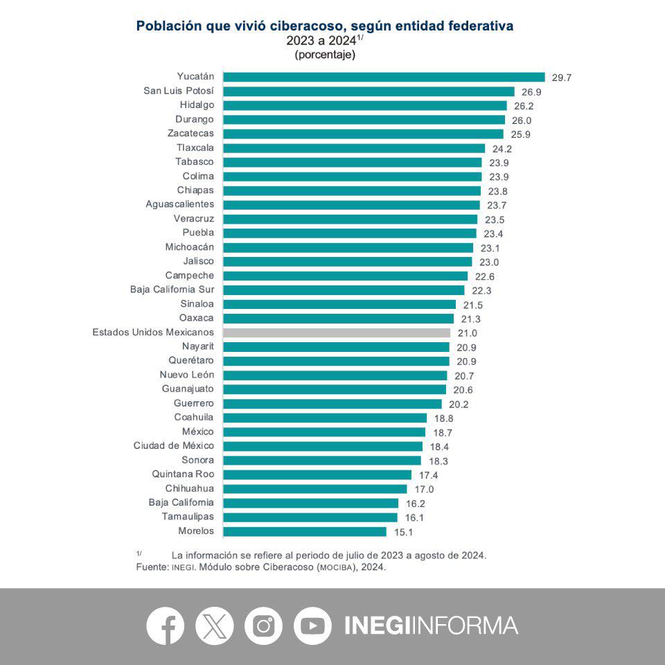 Tlaxcala se ubicó en el sexto lugar a nivel nacional con mayor proporción de personas que vivieron ciberacoso, según el Módulo sobre Ciberacoso (MOCIBA) 2024 del Instituto Nacional de Estadística y Geografía (INEGI). El informe revela que el 24.2% de la población tlaxcalteca de 12 años o más fue víctima de alguna forma de violencia digital entre julio de 2023 y agosto de 2024.
