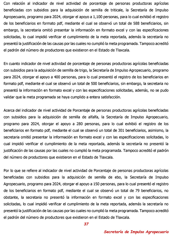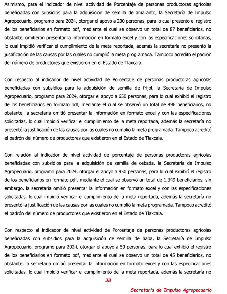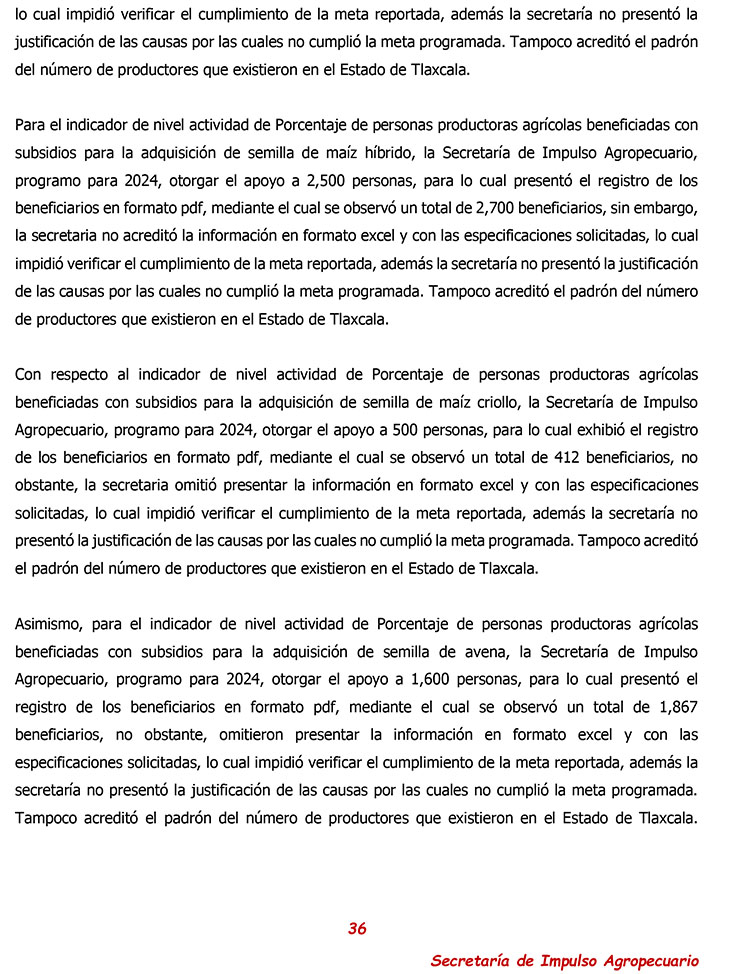 Ejemplo de lo anterior fue que, el OFS identificó que en el programa “Subsidios para la adquisición de semillas”, la SIA dijo haber otorgado apoyos a cuatro mil personas, sin embargo, el formato PDF que presentó demostró un padrón de ocho mil 424.