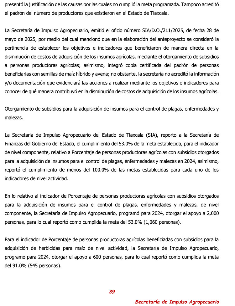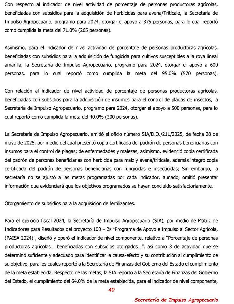 Respecto del otorgamiento de “Subsidios para la adquisición de insumos para el control de plagas, enfermedades y malezas”, la Secretaría de Impulso Agropecuario igualmente tuvo observaciones correspondientes al total de beneficiarios.