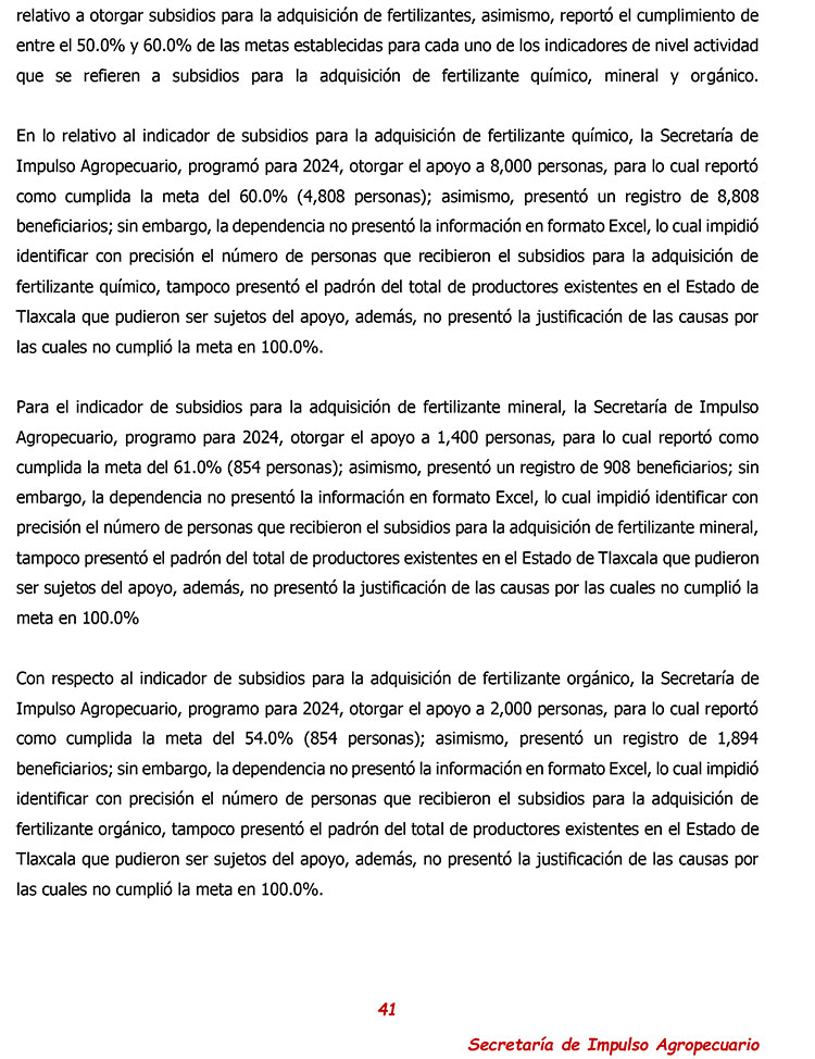 Finalmente, para el “Subsidio para la adquisición de fertilizante mineral” tenía mil 400 y otorgó sólo 854; y para el “Subsidio para la adquisición de fertilizante orgánico” la SIA tenía dos mil apoyos y entregó 854.