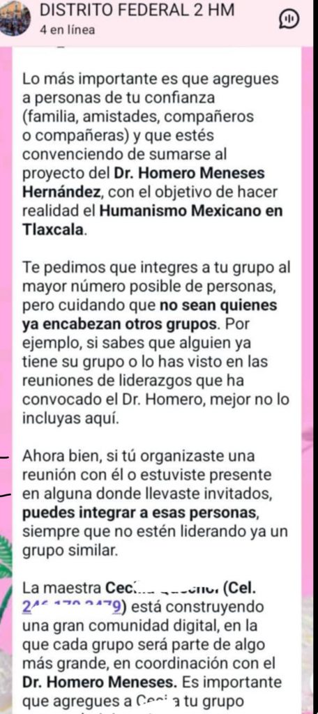 En tanto, en la captura de pantalla que compartió sobre una conversación de WhatsApp, se aprecia la instrucción que reciben las y los trabajadores para crear sus “comunidades digitales” con el pretexto de utilizar la “estrategia educativa” de “Humanismo Mexicano”, la cual, ahora se sabe, es una estrategia política maquinada por Homero Meneses.