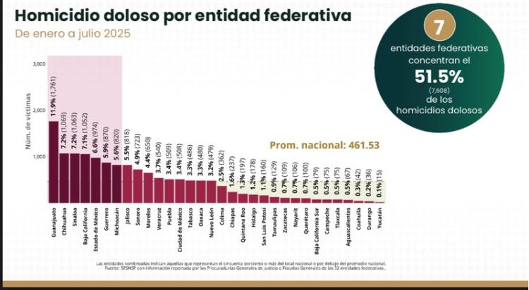 La información oficial reporta que el 51.5% de los homicidios dolosos nacionales se concentran en 12 entidades federativas.