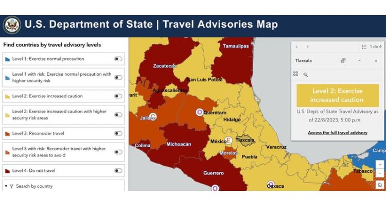 El Aviso de Viaje Estados Unidos de México, emitido el 12 de agosto de 2025, clasifica a Tlaxcala en Nivel 2: Ejerza mayor precaución debido al terrorismo y al crimen. El documento indica que existe riesgo de violencia en la entidad por parte de grupos terroristas, cárteles, pandillas y organizaciones criminales, y recomienda a los viajeros revisar un mapa de áreas restringidas. En este nivel también se incluyen estados como Tabasco y Veracruz, este último en Nivel 1: Ejerza las precauciones normales.