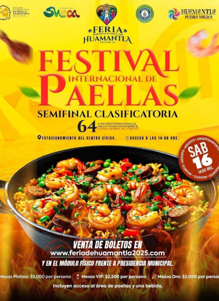 El Gobierno Municipal de Huamantla informa que los boletos Platino para el esperado Festival de Paellas ya están agotados. Solo quedan disponibles localidades en las zonas VIP y General para disfrutar de este evento único en el marco de la Feria Internacional del Arte Efímero y la Dalia 2025.