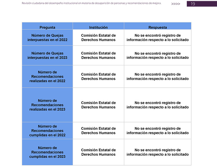 Cabe señalar que, según la información recopilada por la Red Lupa y el IMDHD, la Comisión Estatal de Derechos Humanos Tlaxcala (CEDHT), presidida por Jakqueline Ordoñez Brasdefer, no cuenta con registro de “Quejas Interpuestas” ni en 2022, ni en 2023, así como tampoco ha emitido Recomendaciones en materia de desaparición de personas.