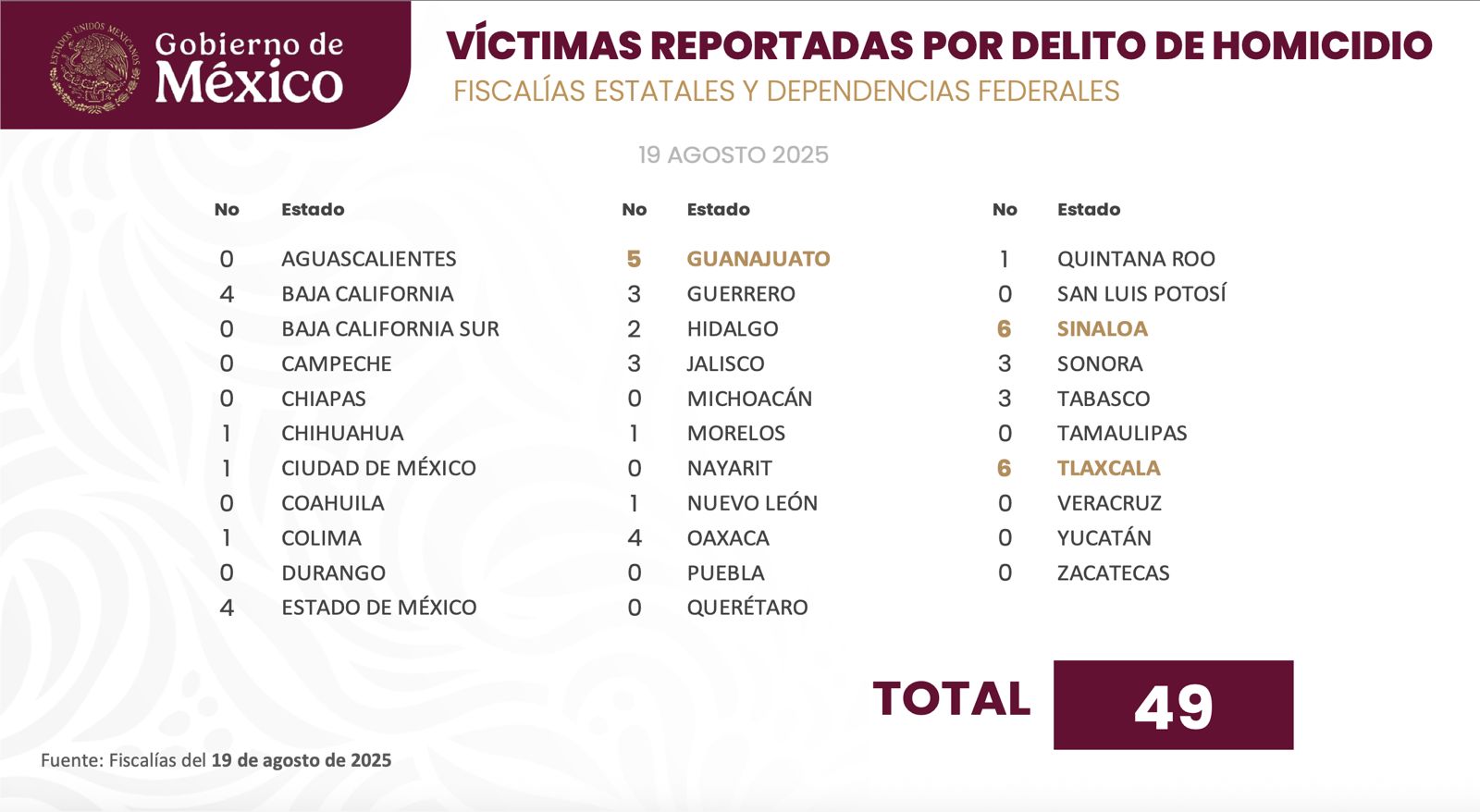 Según el balance diario del Gobierno de México, que encabeza Claudia Sheinbaum Pardo, Tlaxcala igualó el número de homicidios dolosos reportados por Sinaloa en un día ya que también tuvo seis el martes pasado.