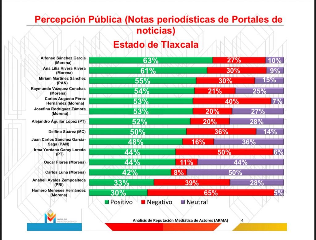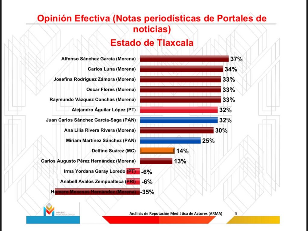 El más reciente Análisis de Reputación Mediática de Actores (ARMA), realizado por la consultora Impulso Mercadológico del 16 de julio al 15 de agosto de 2025, colocó al morenista Alfonso Sánchez García como el aspirante a la gubernatura de Tlaxcala con mayor presencia y mejor percepción en los medios de comunicación.