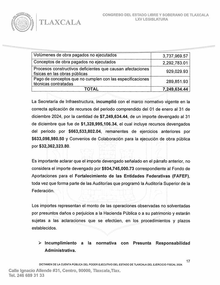En tanto, el Probable Daño Patrimonial de la SI, actualmente a cargo de Eduardo Rubén Hernández Tapia, ascendió a siete millones 249 mil 634.44 pesos, por «Volúmenes de obra pagados no ejecutados» y «Conceptos de obra pagados no ejecutados».