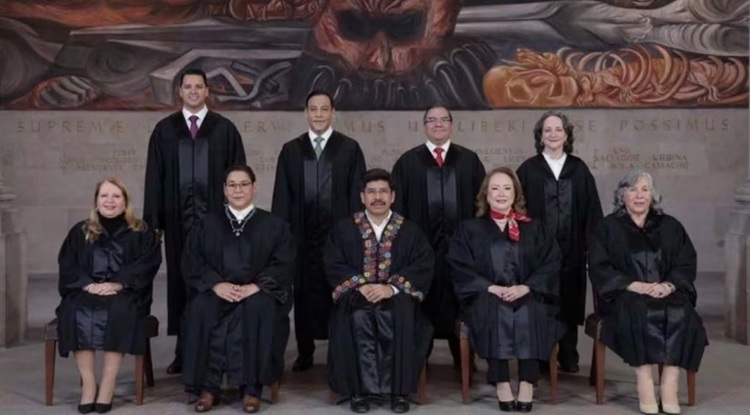 Al centro de la imagen aparece el ministro presidente Hugo Aguilar Ortiz, con una toga con atuendos indígenas en solapa y manga, en honor a los pueblos indígenas del país.