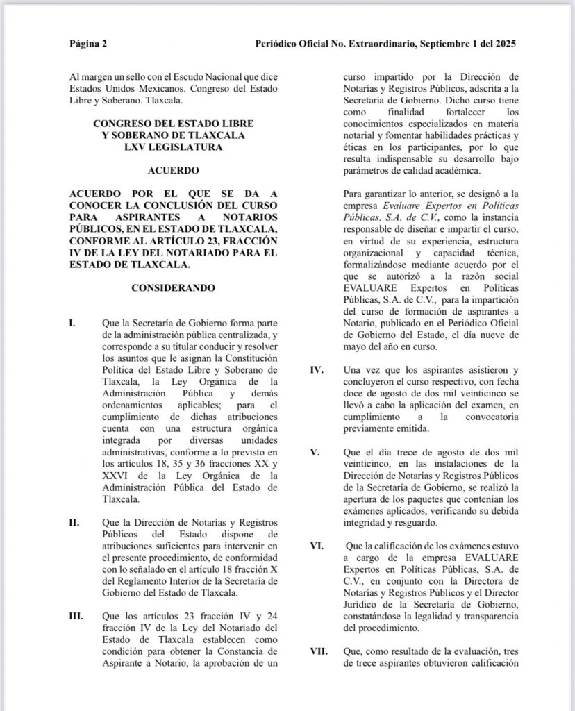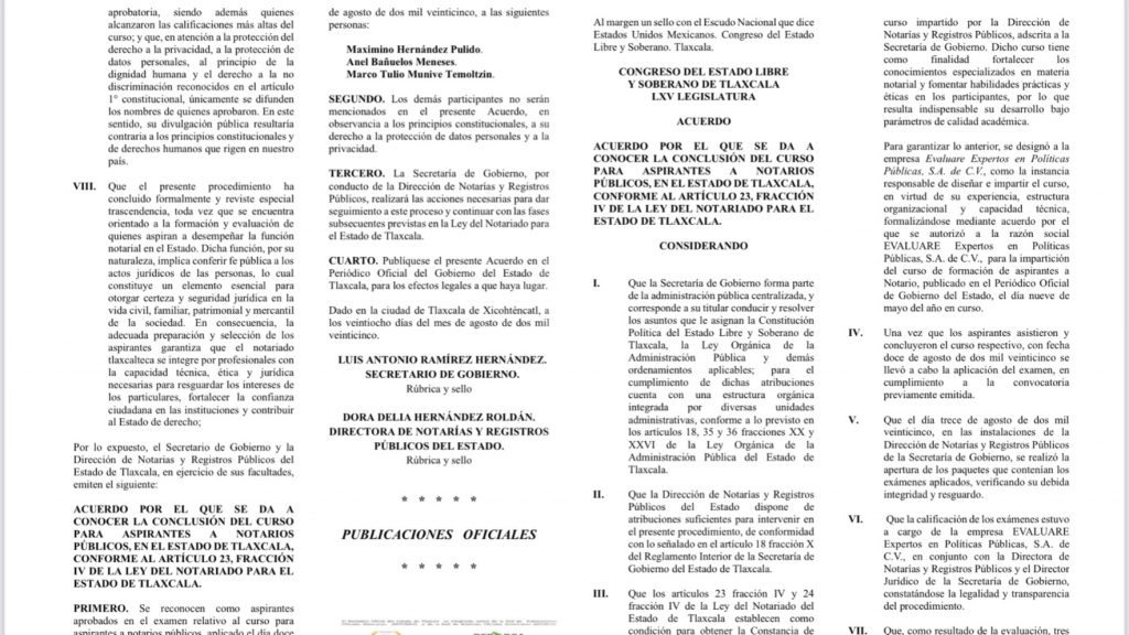 El Periódico Oficial del Estado publicó este 1 de septiembre el acuerdo mediante el cual se da a conocer la conclusión del curso para aspirantes a notarios públicos en Tlaxcala, proceso en el que únicamente tres personas obtuvieron calificación aprobatoria: Maximino Hernández Pulido, Anel Bañuelos Meneses y Marco Tulio Munive Temoltzin .