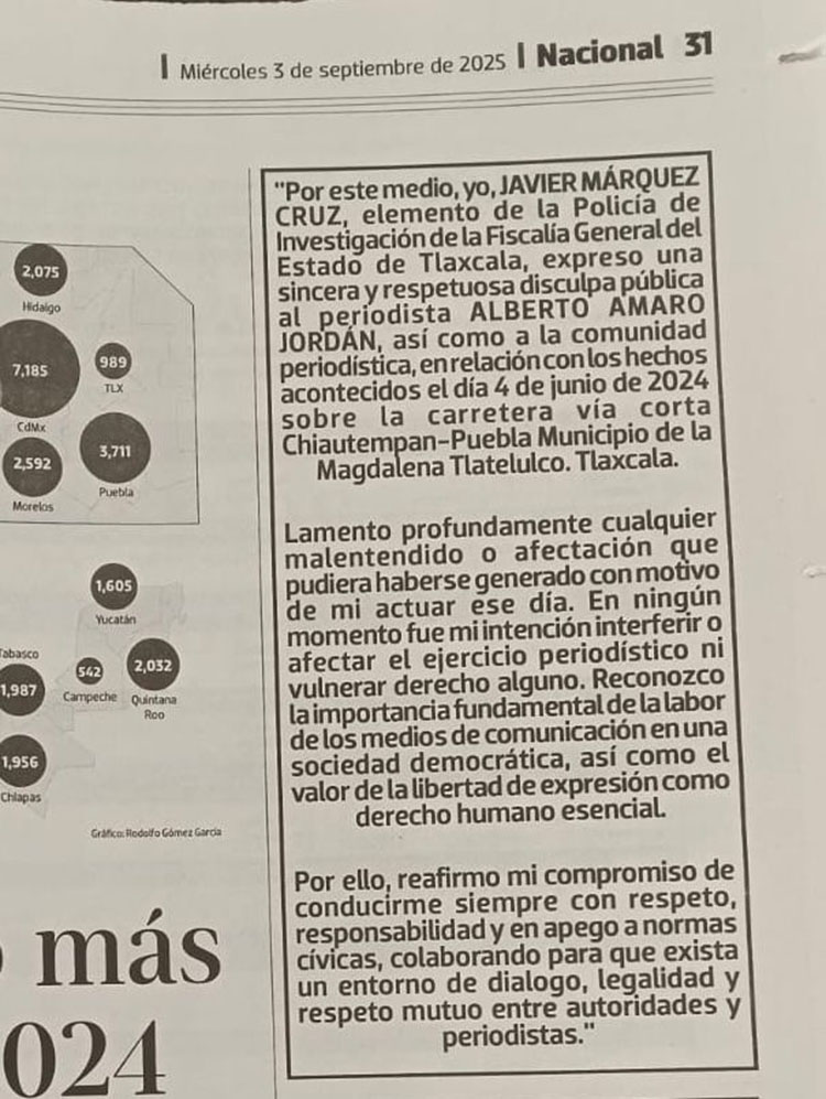 “Por este medio, yo, JAVIER MÁRQUEZ CRUZ, elemento de la Policia de Investigación de la Fiscalía General del Estado de Tlaxcala, expreso una Sincera y respetuosa disculpa pública al periodista ALBERTO AMARO JORDÁN, así como a la comunidad periodística, en relación con los hechos acontecidos el día 4 de junio de 2024 sobre la carretera vía corta Chiautempan-Puebla Municipio de la Magdalena Tlatelulco. Tlaxcala.