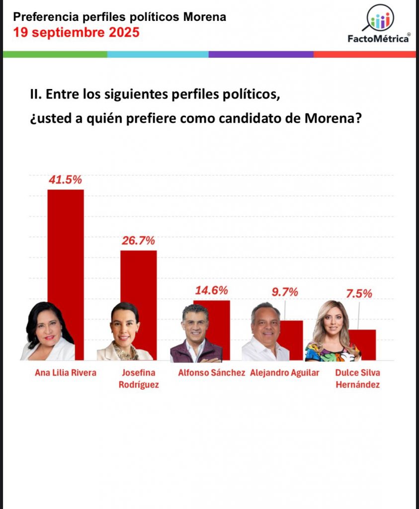 En este mismo estudio, resalta que Josefina Rodríguez mantiene una tendencia de crecimiento, y ha alcanzado el 26.7% de personas de Morena que la respaldarían como candidata. En este mismo planteamiento, Ana Lilia Rivera es primer lugar, pero no ha podido avanzar en las últimas mediciones.