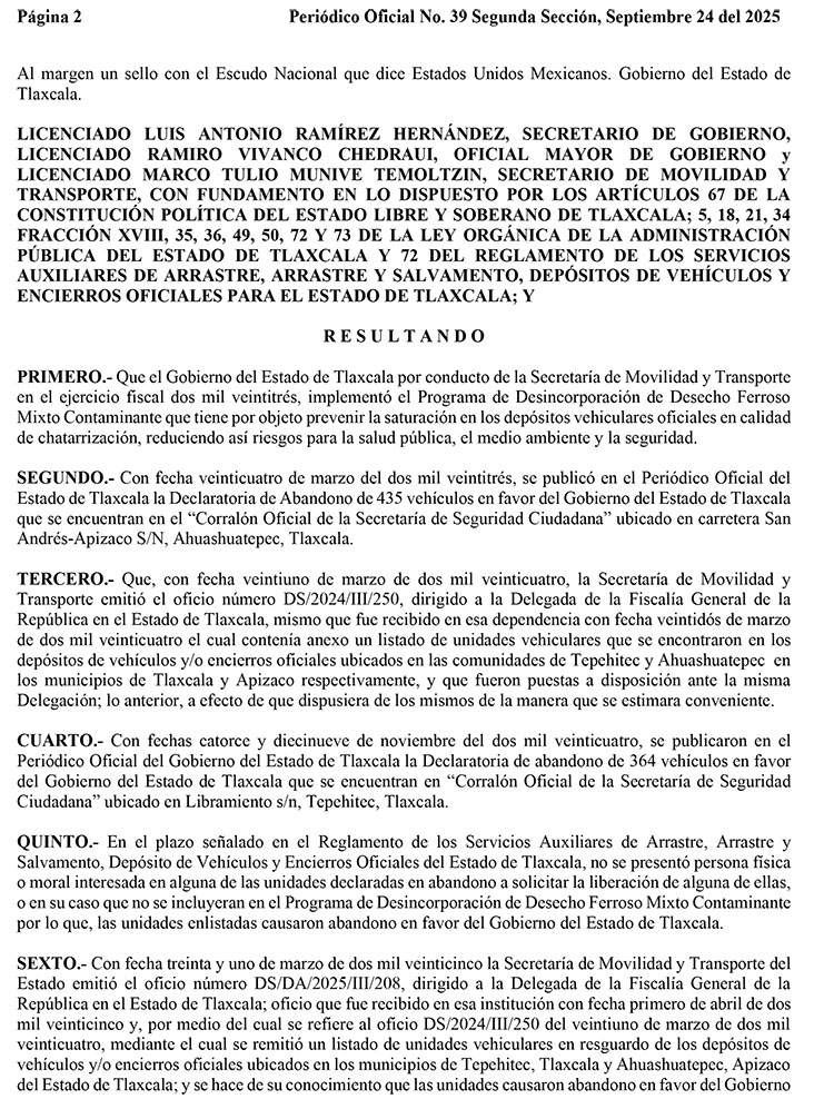Ahora, luego de los procesos legales para determinar que la administración estatal de la electa de Movimiento Regeneración Nacional (MORENA) en Tlaxcala, puede disponer de ellos, emitió un Acuerdo con fundamento en el Reglamento de los Servicios Auxiliares de Arrastre, Arrastre y Salvamento, Depósitos de Vehículos y Encierros Oficiales.