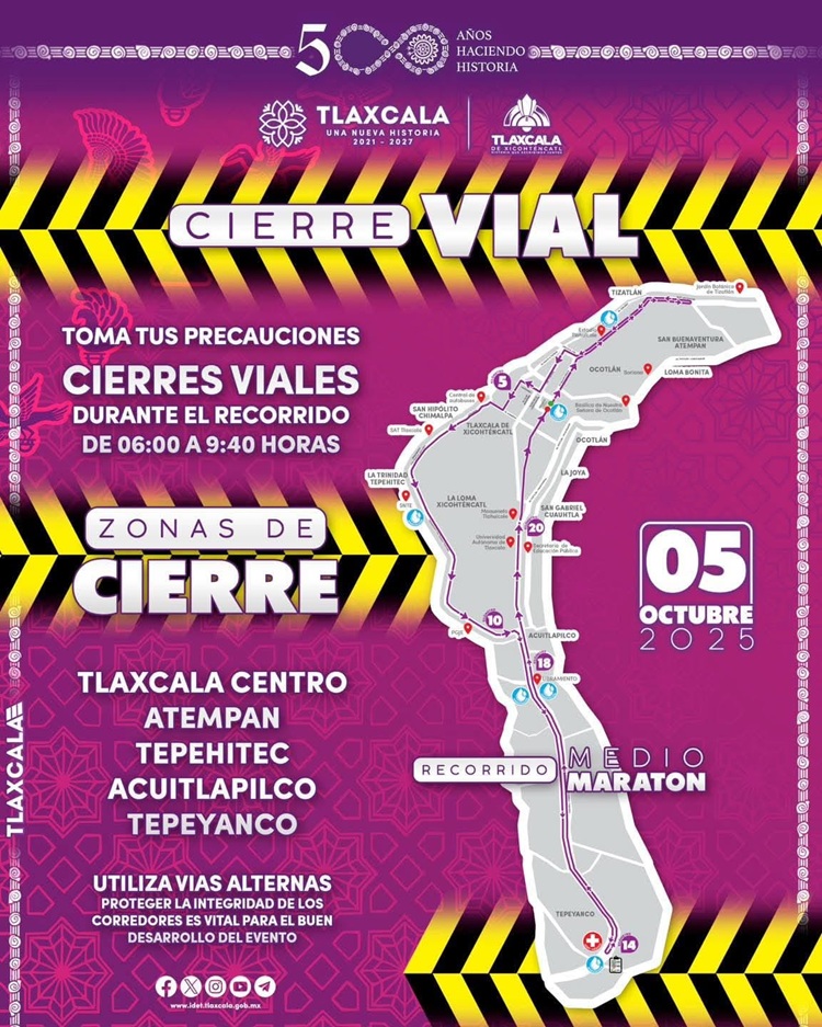 Para asegurar que el Medio Maratón Internacional Tlaxcallán 2025, que se llevará a cabo el próximo domingo 5 de octubre en la capital tlaxcalteca, se desarrolle en orden y con plenas condiciones de seguridad, la policía municipal de Tlaxcala trabajará de manera coordinada con la Secretaría de Seguridad Ciudadana (SCC) en un amplio operativo de cierres viales.