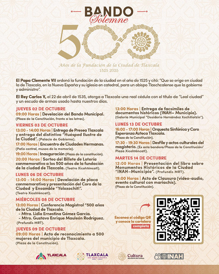 El Bando Solemne integra 13 eventos entre los que destacan la entrega de la Presea Tlaxcala y del Distintivo “Huésped Ilustre de la Ciudad”, así como la develación del Billete de Lotería conmemorativo a los 500 años de la Fundación, además del Acto de Reconocimiento a 500 Mujeres del Municipio de Tlaxcala, entre otros más de carácter cultural y artístico.