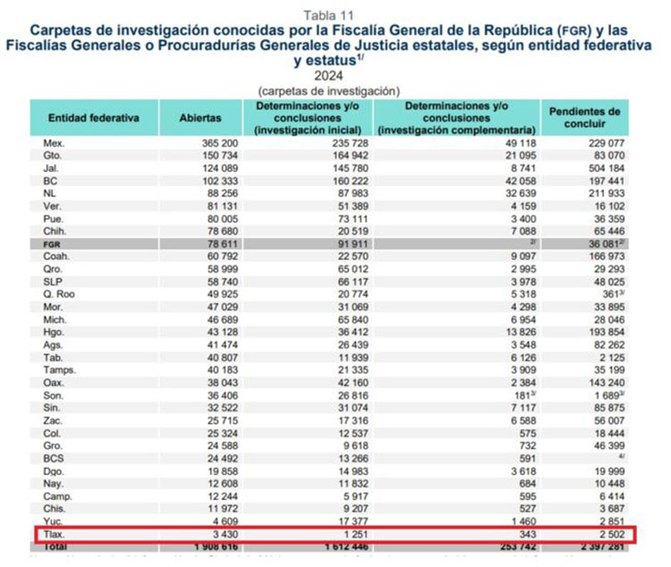 El año pasado, la Fiscalía de Tlaxcala reportó que abrió 3 mil 430 carpetas de investigación, de las cuales 3 mil 416 correspondieron a personas adultas y 14 relacionadas con justicia para adolescentes.