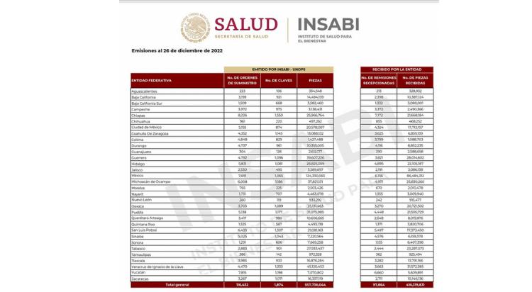 El informe, con corte al 26 de diciembre de 2022, muestra que Tlaxcala registró 4,470 órdenes de suministro, correspondientes a 933 claves médicas y un total de 16 millones 876 mil 284 piezas emitidas. De esas, la entidad recibió 3,862 remisiones, equivalentes a 13 millones 479 mil 396 piezas, según los datos oficiales del INSABI-UNOPS.
