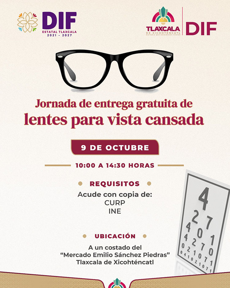 El Sistema Municipal para el Desarrollo Integral de la Familia (SMDIF) del Ayuntamiento capitalino invita a una jornada de entrega gratuita de lentes, la cual está dirigida a personas con vista cansada, que tendrá lugar este jueves 9 de octubre.