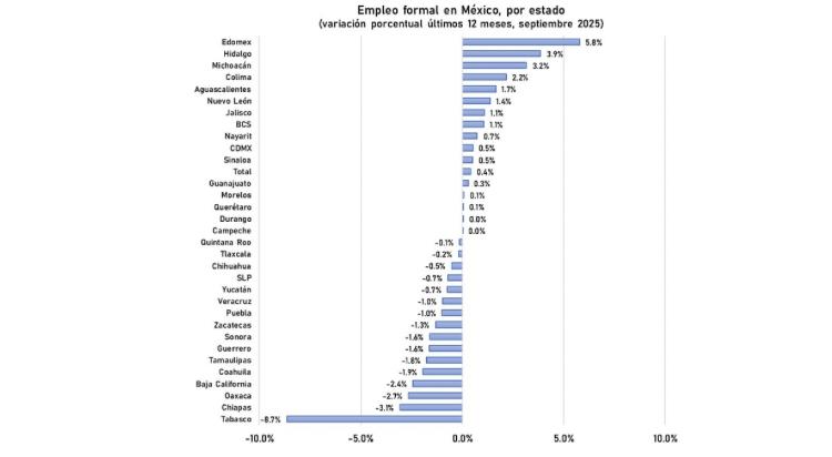 De acuerdo con el consultor económico Carlos Ramírez F., el empleo formal en México muestra un panorama desigual entre entidades. Mientras el Estado de México encabeza la lista con 109 mil 233 nuevos puestos formales en los últimos 12 meses, Tlaxcala registró una ligera caída de 224 empleos, lo que representa una variación negativa de 0.1 por ciento en el mismo periodo.