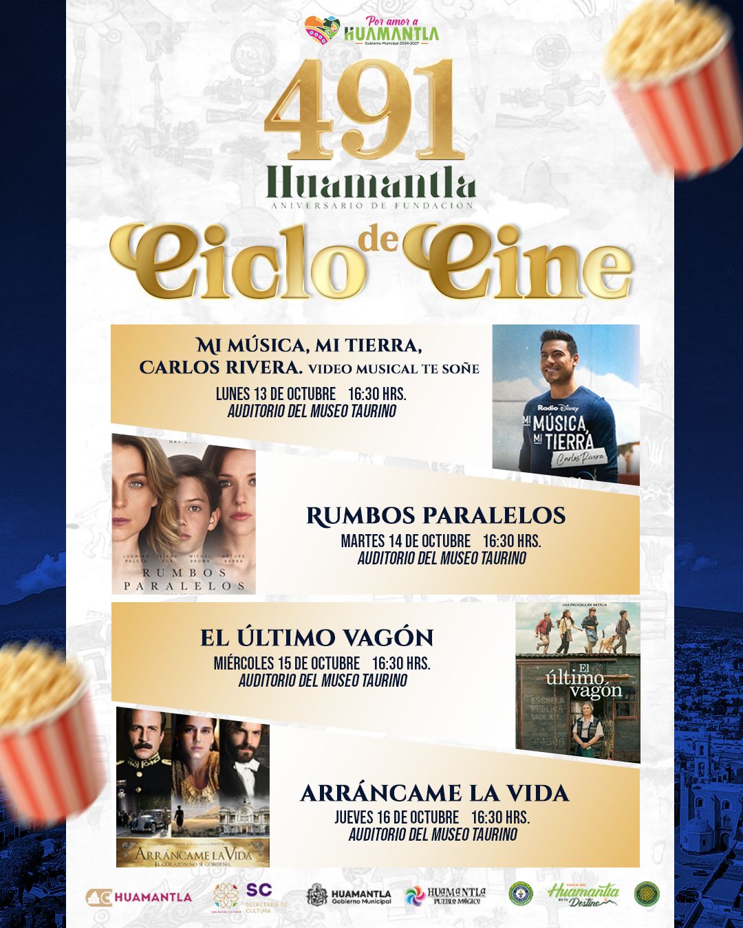 El H. Ayuntamiento de Huamantla, a través de la Dirección de Turismo, Cultura y Desarrollo Taurino, invita a la ciudadanía a disfrutar del Ciclo de Cine que se llevará a cabo del 13 al 16 de octubre en el Auditorio del Museo Taurino, a partir de las 4:30 de la tarde, como parte de las actividades conmemorativas por el 491 aniversario de la fundación de Huamantla.