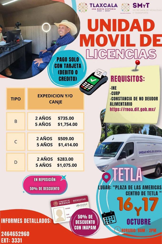 La dependencia informó que la próxima semana, en el municipio de Tetla de la Solidaridad, se instalará la unidad los días 16 y 17 de octubre, donde las y los conductores podrán realizar trámites de expedición y renovación de licencias en sus distintas modalidades.