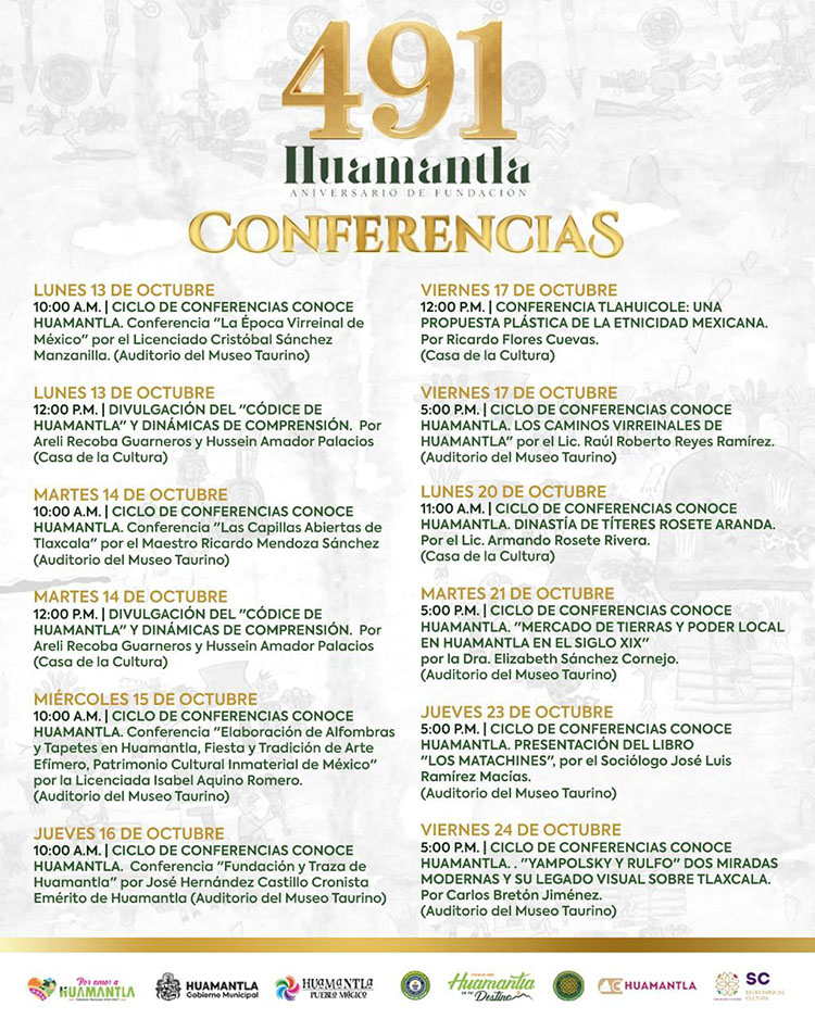 Como parte de las actividades conmemorativas por el 491 aniversario de la fundación de Huamantla, el H. Ayuntamiento, a través de la Dirección de Turismo, Cultura y Desarrollo Taurino, encabezada por el Lic. Marco Antonio Galindo Vallejo llevará a cabo un Ciclo de Conferencias que tiene como objetivo difundir el valor histórico, cultural y social del municipio, fortalecer el sentido de pertenencia y promover el diálogo entre ciudadanía y especialistas.