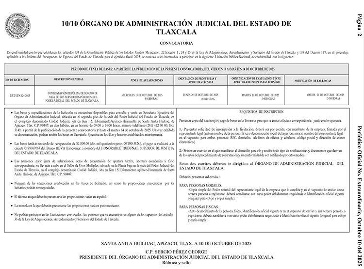 A través de una publicación con Número Extraordinario en el Periódico Oficial, el OAJ de Tlaxcala dio a conocer la Licitación Pública Nacional PJET/LPN/024-2025 para la contratación de un seguro de vida para las y los trabajadores del Poder Judicial del Estado de Tlaxcala, de conformidad con la Ley de Adquisiciones, Arrendamiento y Servicios local.