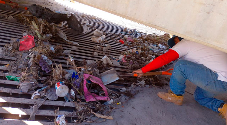 Asimismo, se efectuaron labores de limpieza y desazolve de rejillas, donde se detectó una gran cantidad de basura que impedía el correcto flujo del agua y generaba focos de contaminación, particularmente en la rejilla ubicada sobre calle Zaragoza, a la altura de la CFE.