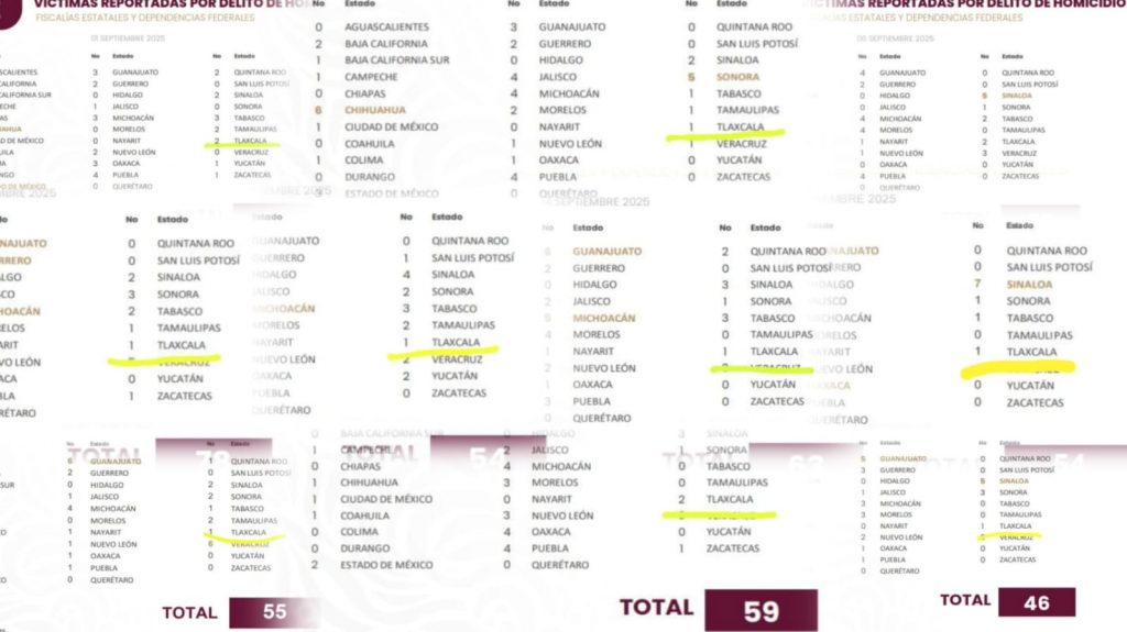 Aunque durante la primera semana de octubre en su conferencia diaria la Presidenta de México, Claudia Sheinbaum Pardo, informó que, de enero a septiembre, Tlaxcala acumuló 95 víctimas de homicidio doloso, según el SESNSP, la Comisión Nacional de Seguridad (CNS) contabilizó 141 en el mismo periodo.