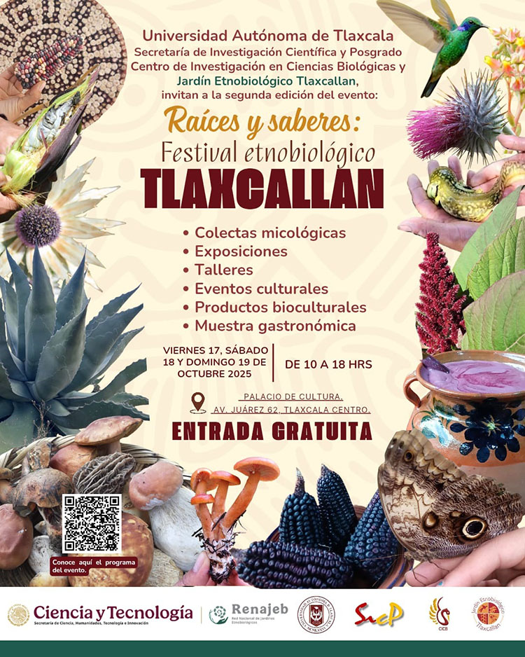 Por segundo año consecutivo el Jardín Etnobiológico Tlaxcallan de la Universidad Autónoma de Tlaxcala (JET-UATx) llevará a cabo el encuentro Raíces y Saberes: Festival Etnobiológico Tlaxcallan, que busca rescatar y difundir los conocimientos bioculturales de México, con especial énfasis en el contexto tlaxcalteca, los días 17, 18 y 19 de octubre en el Palacio de la Cultura de Tlaxcala.