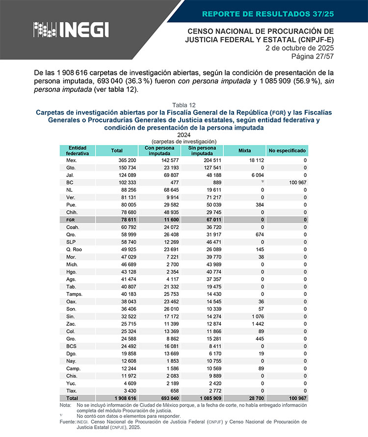 En tanto, en dos mil 722 Carpetas de Investigación iniciadas por las Fiscalías no se contaba con persona imputada, toda vez que, se tenían dos mil 502 indagatorias sin concluir, según la información recopilada por el INEGI.