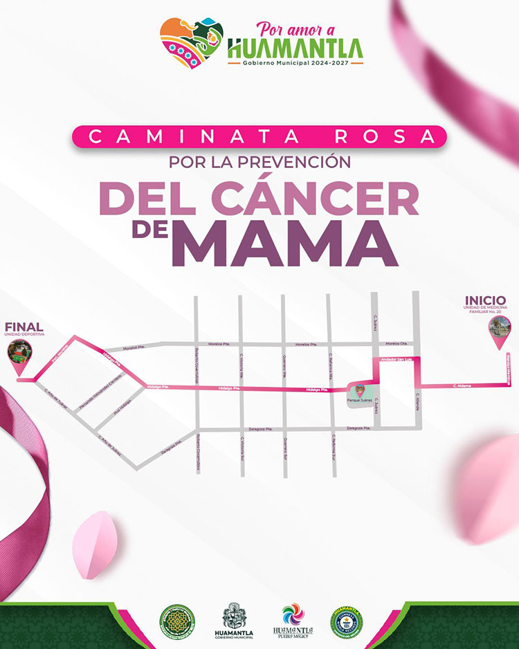 El Gobierno Municipal de Huamantla, que encabeza el presidente Salvador Santos Cedillo, a través de la Coordinación de Deporte, invita a la ciudadanía a sumarse a la Caminata Rosa, que se realizará este lunes 20 de octubre a las 8:00 de la mañana, partiendo de la Unidad de Medicina Familiar No. 20 con destino a la Unidad Deportiva Huamantla.